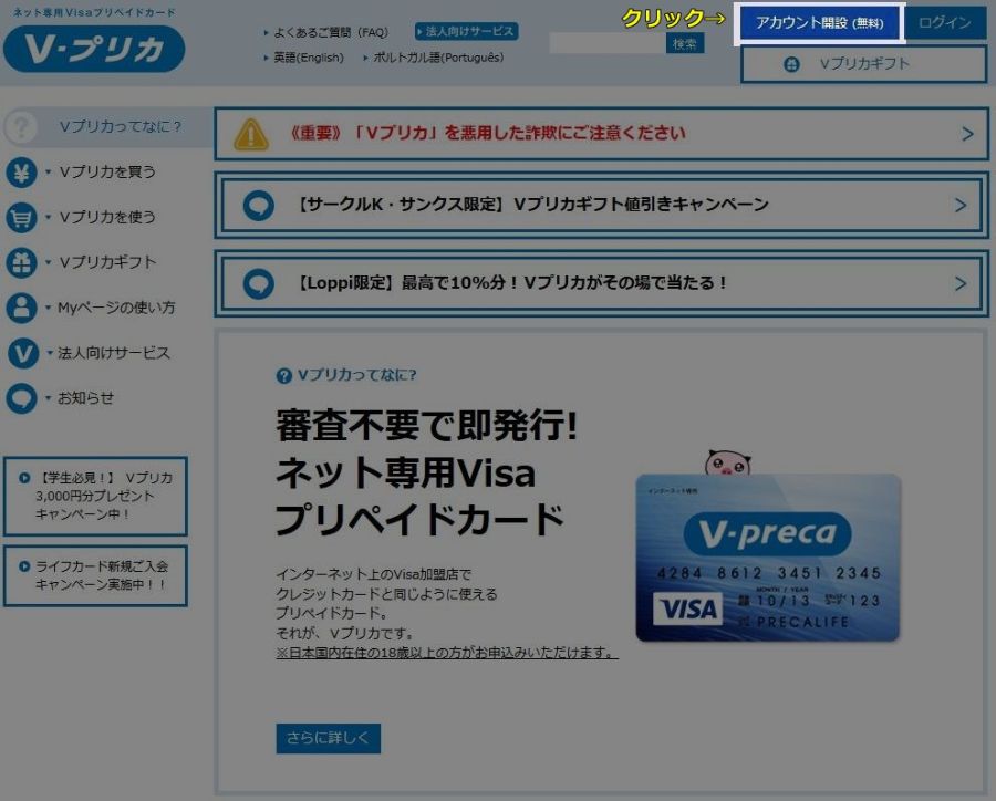 下の図のようなVプリカ公式サイトに移動したら、ページ右上の「アカウント開設(無料)」ボタンをクリックしてください。