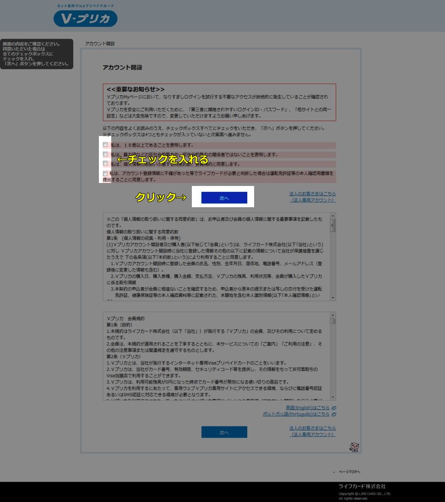 「アカウント開設(無料)」ボタンをクリックすると、下の図のような画面に行きますので、4項目を読んで同意するならチェックを入れて「次へ」ボタンをクリックしてください。