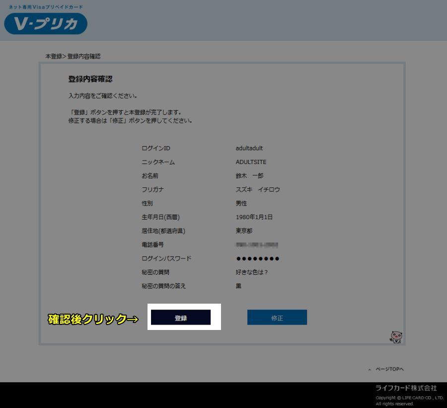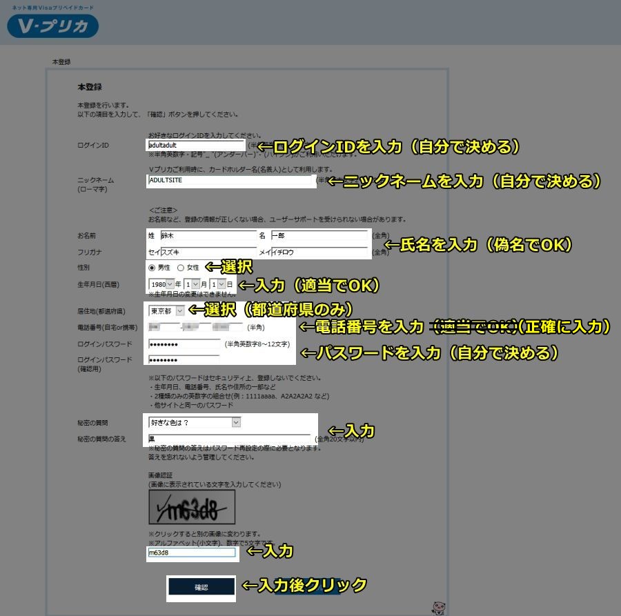 ※以前は電話番号は適当でもよかったのですが、Vプリカの購入にSMS認証/電話認証が導入されました。SMS認証/電話認証の際に電話番号を使うので、携帯電話(“070”、“080”、“090”含む)、または固定電話番号のいずれかが必要になりますので、電話番号はお持ちの電話の番号を正確に入力しましょう。(管理人は勧誘や迷惑な電話がかかってくることはこれまではありませんでした。)