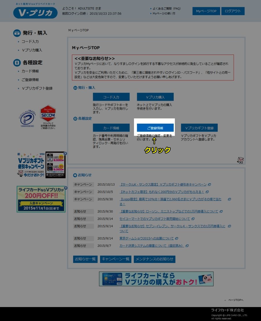 Vプリカ(vカード)のトップページからログインしMyページ画面に移動し(やり方は上記のpoint1〜point2参照)、「カード情報」をクリックしてください。