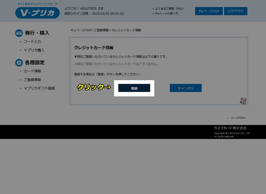 - クレカ会社を選択(利用できるクレカ会社はライフカード、VISA、Mastercardです)