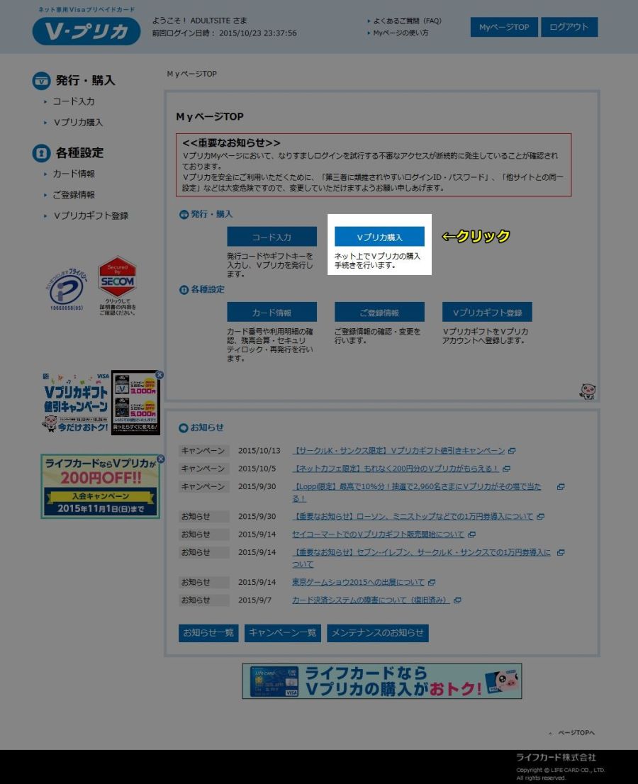 「ログイン」ボタンをクリックして下の図のようなMYページ画面に移動したら、「プリペイドカードVプリカ(vpreca)購入」ボタンをクリックしてください。