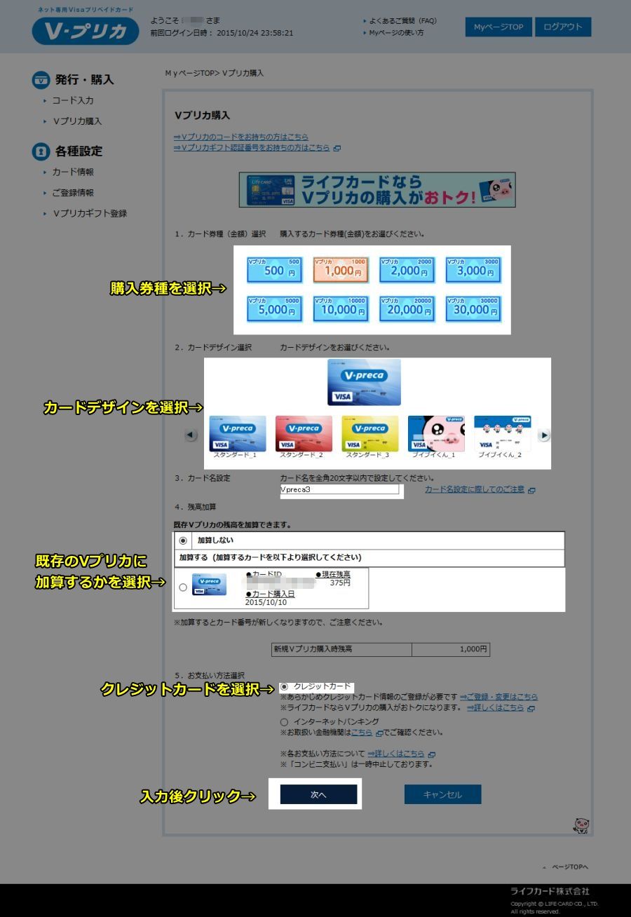 続いて一本道の加入で使えるVプリカの購入に進みます。