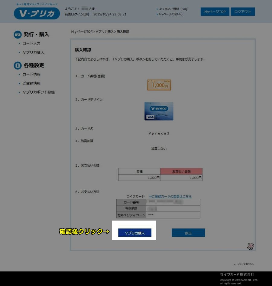 「次へ」をクリックして下の図のような確認画面に移動し入力事項を確認してOKなら「vカード購入」をクリックして購入完了です。